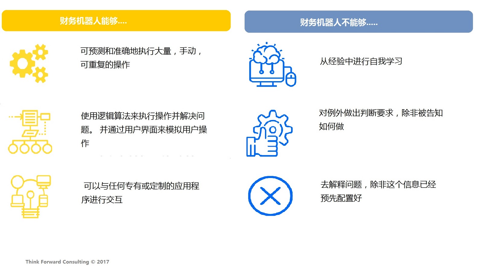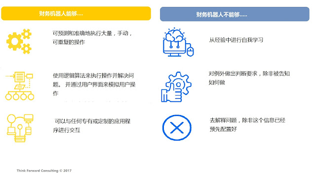 同时针对企业高管就财务机器人究竟能够做些什么及其局限性的问题,这家咨询公司也比较了现阶段财务机器人能做的和不能做的。