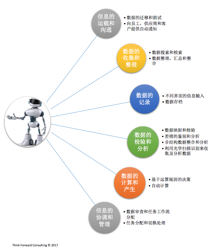 究竟RPA能够做什么工作,澳大利亚商务智能咨询公司Think Forward Consulting Group列出了在目前财务机器人RPA能够涉及的领域,相信随着人工智能的发展,这个趋势会更加深入到各个领域