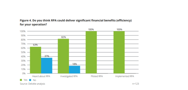 在企业部署了RPA后有什么效果,德勤会计师事务所曾经有份统计报告,目前正在测试和已经运行RPA的企业,100%的认为有了RPA后,企业为此收益。持怀疑及保留态度的多为没有真正接触过RPA的企业